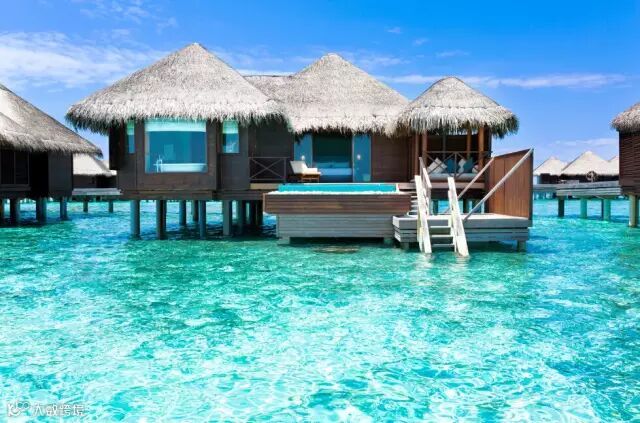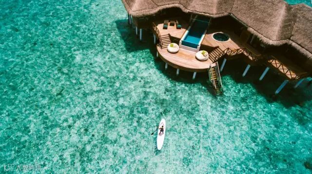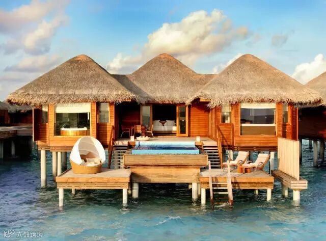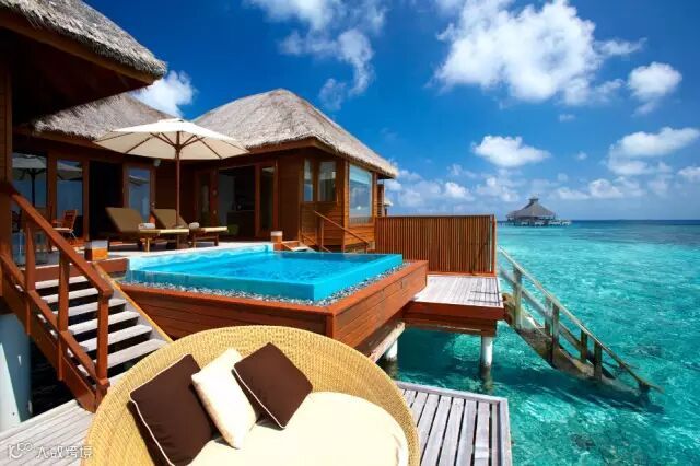 水上屋是马尔代夫芙花芬岛海边的特色建筑,直接建在蔚蓝透明的海水之上,住在其中,不仅能饱览海里五彩斑斓的热带鱼、鲜艳夺目的珊瑚礁以及岸边雪白晶莹的沙滩、婆娑美丽的椰树、返璞归真的茅草屋,也能聆听清亮的海鸟鸣叫。水上屋的另一亮点就是露台,一般面积都很大,放几把躺椅,或是一张水上吊床,你可以仰卧躺椅,也可以斜倚吊床。清晨欣赏绚丽、纯静的海上日出;晚上在满天繁星下,任思绪飞扬,沉醉在天堂般的幻境之中。此时寂静无声,除却海浪声,真的是枕着波涛入眠。露台还是下海畅游嬉戏的地方,你可以直接从露台经过梯子,下到海里进行海水浴,方便至极。