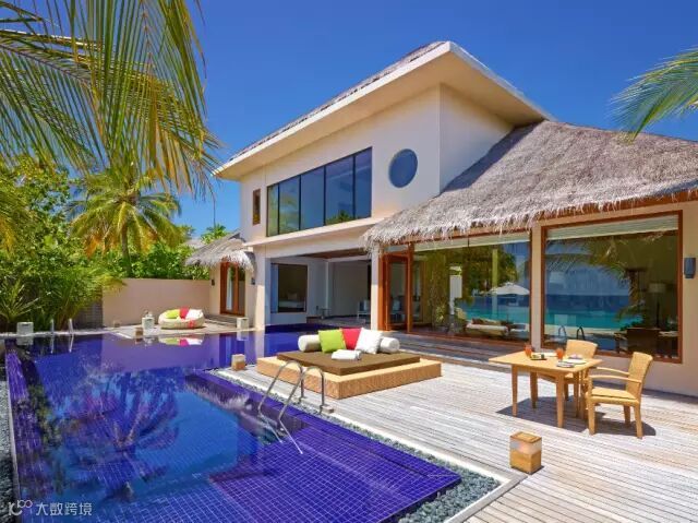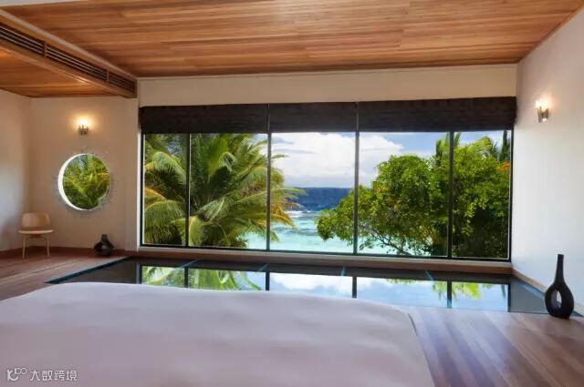 前卫的设计,客人主用的沙滩,一望无际位于上层的主卧室大量采用玻璃建材,通过主卧室的玻璃地板,可以一眼望到蔚蓝透明的海水,同样整片的玻璃墙让您知道蓝色珊瑚礁的奥妙,穿过专用的楼梯井,岛室外花园,露天淋浴,豪华的按摩浴缸,让您如初生婴儿般娇嫩,宽敞的次卧室有独立的观景露台,有室内和户外开放式卫浴设备,从餐厅俯瞰泳池,池水是从别墅外的海水引入,在用餐区享受美食之际,可欣赏到自然造景的水塘,贴身管家会24小时提供您完善的服务,满足您任何的需求。