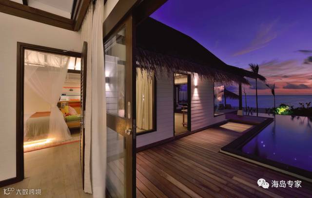 房型介绍:此别墅具有两个特色 – 8米长, 20平方米大 的包含光纤氛围照明的超大无边泳池。此外,站在池边俯瞰最 原始的环礁湖和马尔代夫的日落美景!