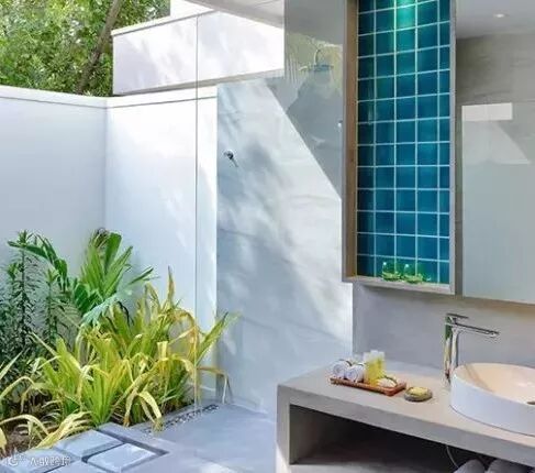 海滩别墅宁静而优美,浴室设有室内室外空间,充满乡土植物的气息,还配有淋雨花洒,长浴缸,别墅前有一张沙发椅和日光躺椅。