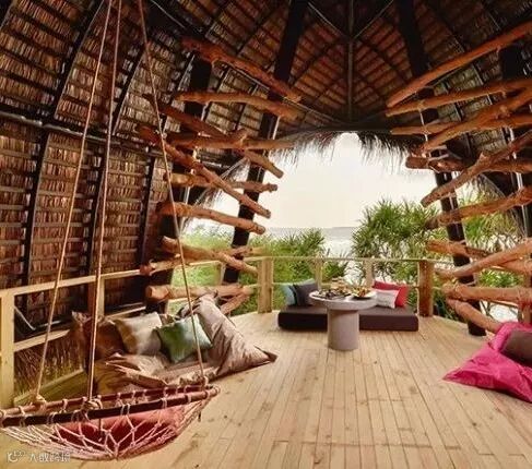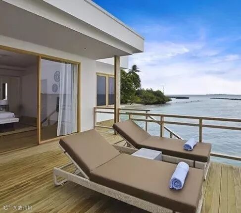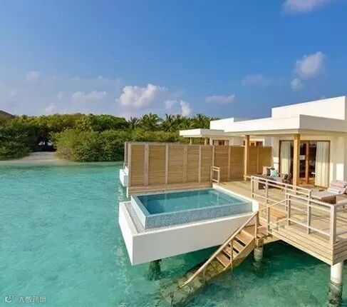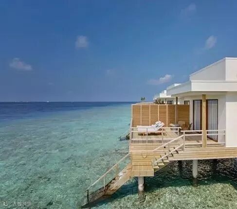 水上别墅建在波光粼粼的泻湖水域上,灿烂的天空下,习习的海风中,听着音乐,赏着美景,让人羡慕。