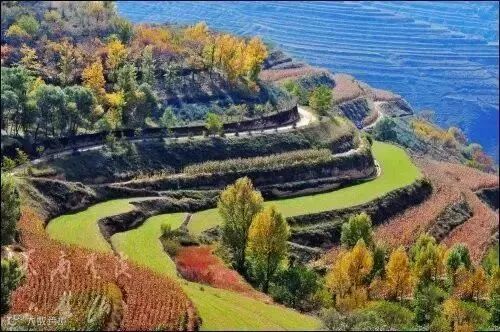 木屋、村落、梯田、树木构成一条美丽的秋日画廊