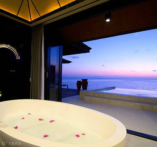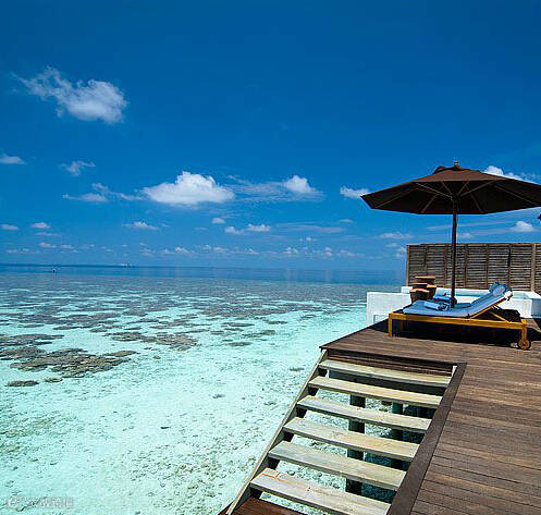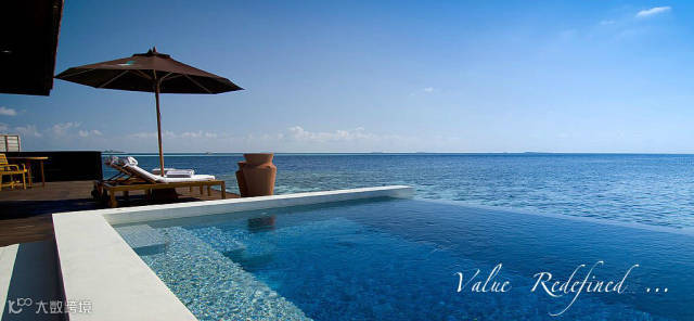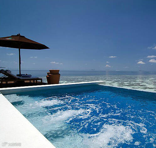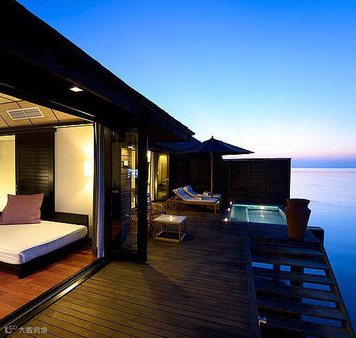 典雅奢华的日落水上套房,拥有一个视野开阔的无边泳池,池水与蓝绿色的海水结合,给客人提供了一个完美的视觉盛宴。客人从套房的阳光平台的楼梯可以直接进入乐彩斑斓的泻湖,亲近丰富的珊瑚礁群。提供24小时私人管家,14平米私人按摩无边泳池。