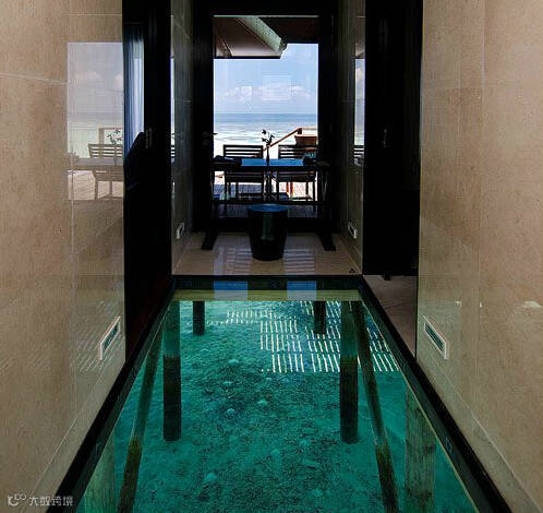 唯美的宽大玻璃地板与自然的实木和大理石家具成就了独具特色的豪华水上别墅。大面积阳光平台,拥有可以直接进入完美的泻湖的楼梯,阳光平台上的按摩浴池,给客人提供了一个宽阔的视野平台。