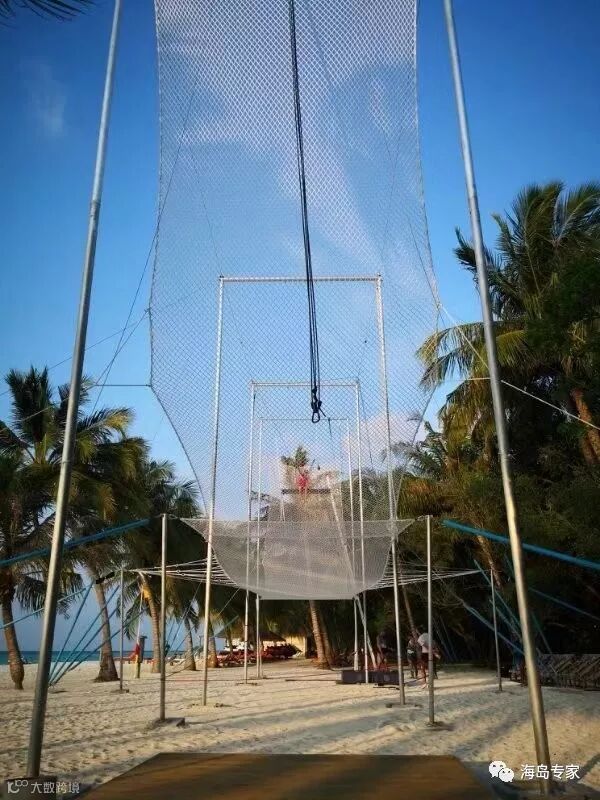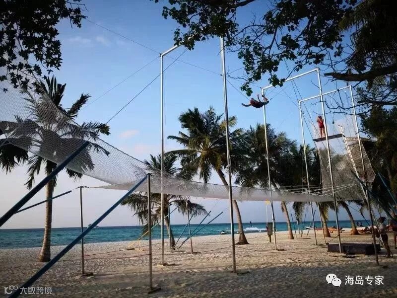 今年,卡尼岛还开设了马代第一家空中飞人学校,在泻湖上空飞行。体验马戏生活:爬上平台,抓住栏杆,向前跳跃。在 G.O的指导下,摇摆在海天之间,几乎可以与椰子树顶肩并肩,十分刺激。