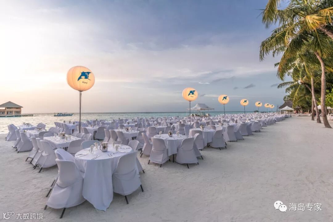 在每周四的夜晚,卡尼还会举行盛大又浪漫的白色沙滩晚宴,白色的沙砾与座位装饰相互映衬,配上湛蓝的印度洋海水,气氛唯美,令人沉醉。