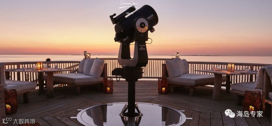 SonevaJani的客人可以在马尔代夫第一个水上观景台上看到闪烁的宝石般的夜空。 这个受欢迎的经历让Soneva Jani姐妹度假胜地Soneva Fushi和Soneva Kiri的客人都惊叹不已! 通过设置在地板上的望远镜,客人可以看到迷人的天空景色。 甲板周围有四个餐桌,您可以在这里用餐。 桌子上装有与望远镜相连的屏幕,让您可以与星星一起用餐。