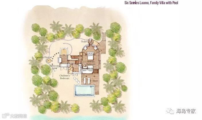 房型介绍:修建于印度洋泄湖之上,内嵌式海洋观景全玻璃浴缸;私人泳池,私人水上花园;户外休闲平台,带休闲椅、日光室和水上护网;水族馆甲板进餐区,全玻璃桌面;全景礁湖水滑道;儿童卧室。