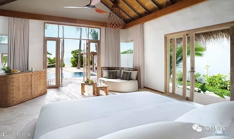 房型介绍:双卧室日落海滩别墅更加别致,750㎡的房型面积提供了足够宽敞的入住空间,是亲子游、家庭游客人的首选房型之一。别墅建在沙滩旁边,种植的热带花园提供了极佳的私密性空间。除了配有两个带独立淋浴的私人浴室, 双水槽,雀巢咖啡机,酒柜,Bose音响系统,加州特大号床等,大型开放式独立的生活空间和餐桌。户外享有户外浴室浴缸和淋浴,还有一个48平方米的游泳池。
