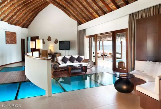 推开落地窗,令室内外浑然一体,构成室内/室外休闲区,透过玻璃地板,脚下礁湖中千姿百态的生物世界展现在眼前。