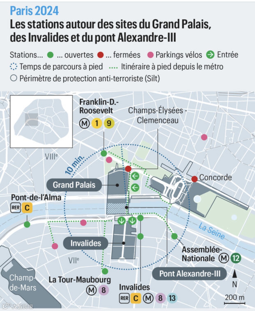Invalides桥和亚历山大三世桥将不可使用。如果您的门票上标注了B区,请优先选择“Franklin-D.-Roosevelt”站;如果标注了C、D、E、F、G或H区,请选择“Invalides”站。