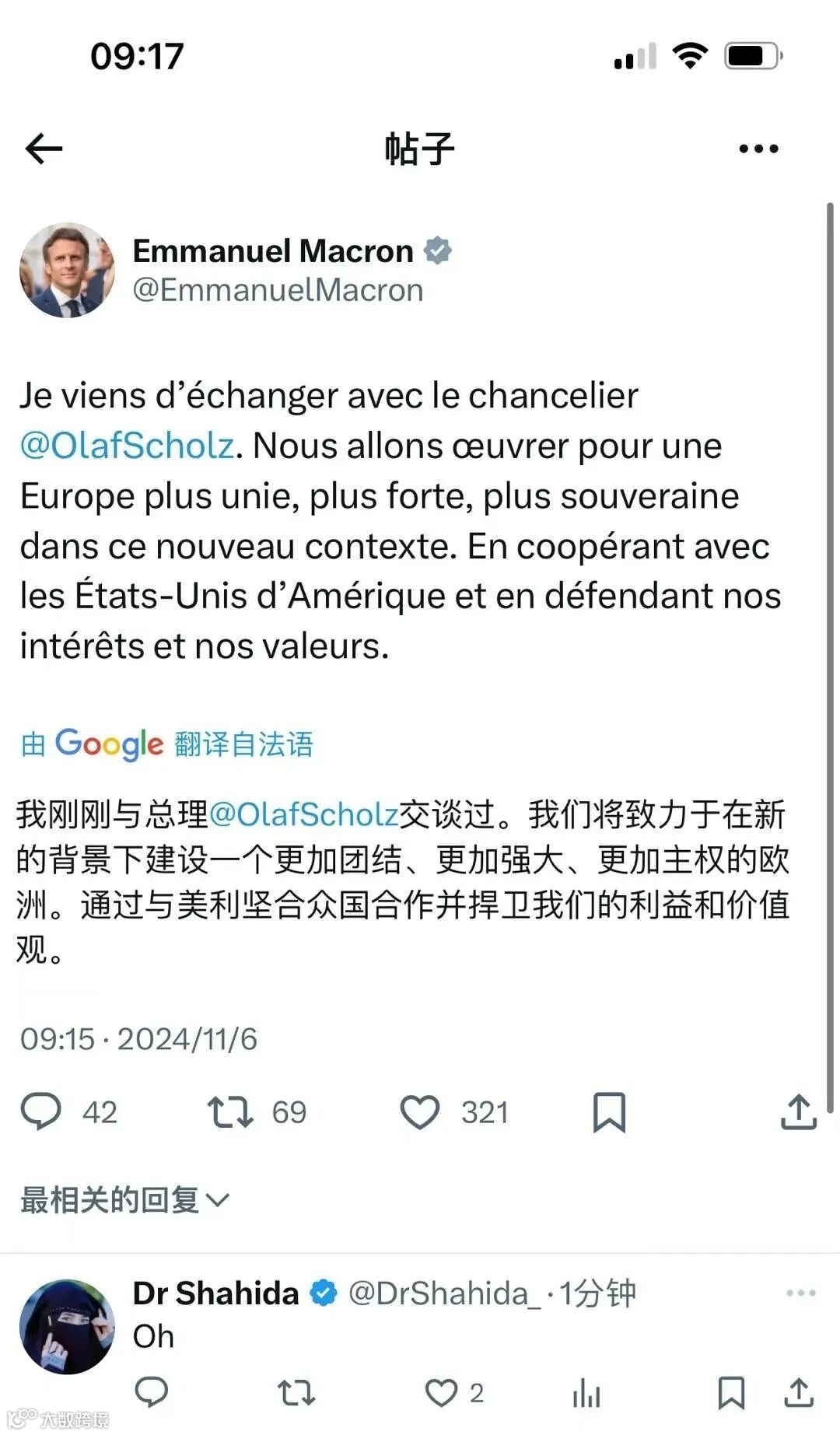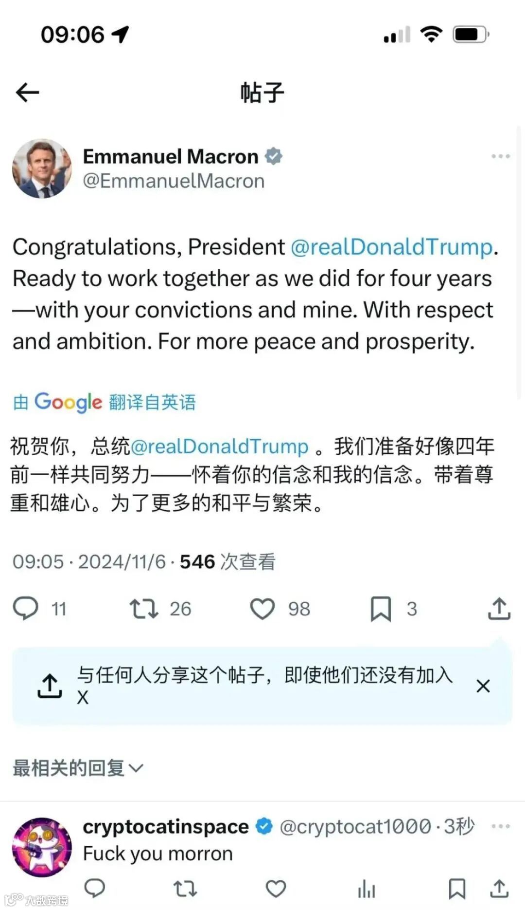 法国总统小马当然不会错过这样的大新闻,川普一当选,立刻就在推特上表示祝贺。