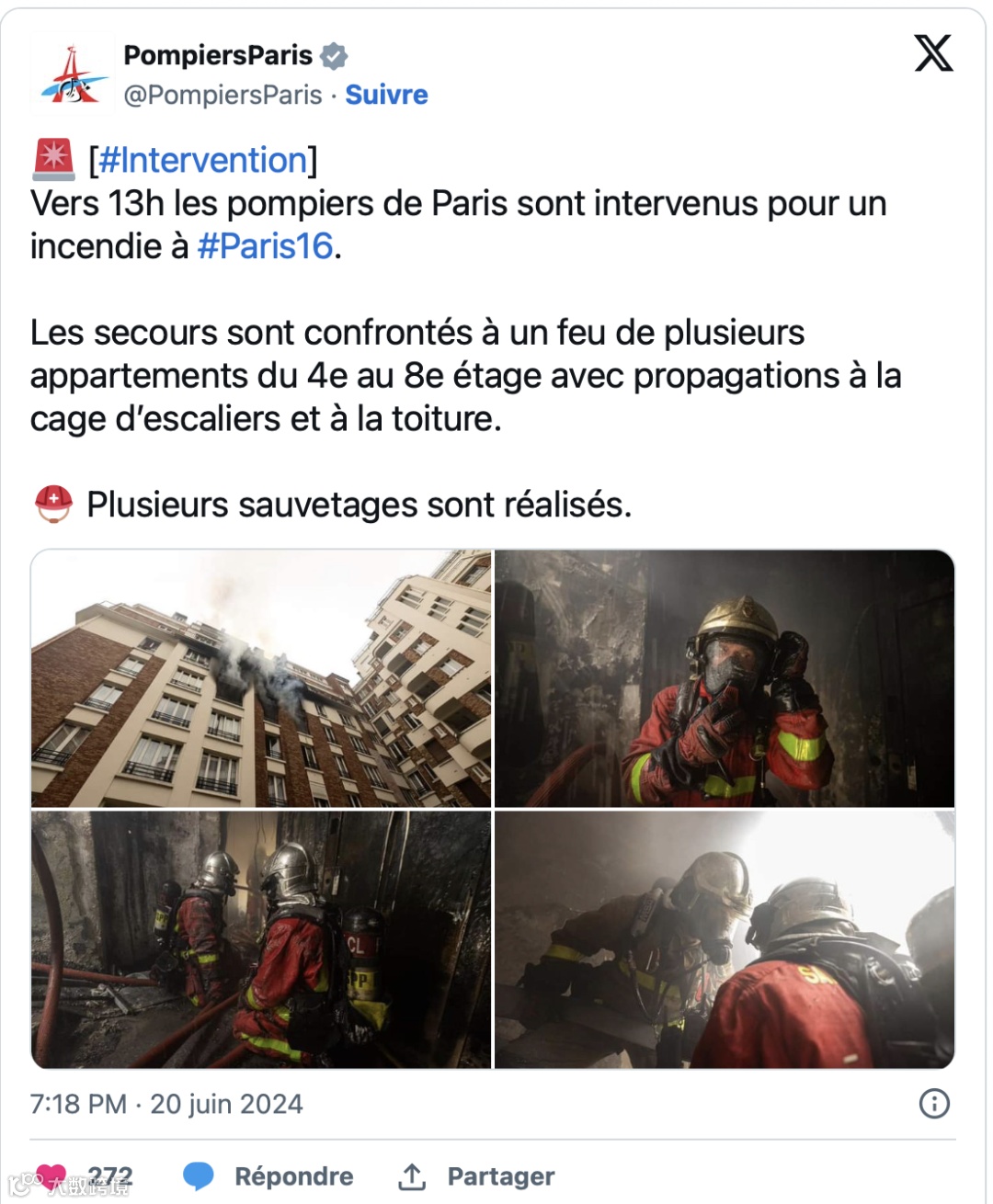 据巴黎消防队(BSPP)介绍,共有175名消防员参与了此次灭火行动。火灾造成五名消防员手部轻度烧伤,部分居民因吸入浓烟被送医治疗。十六区政府在社交媒体上对消防员表示感谢!