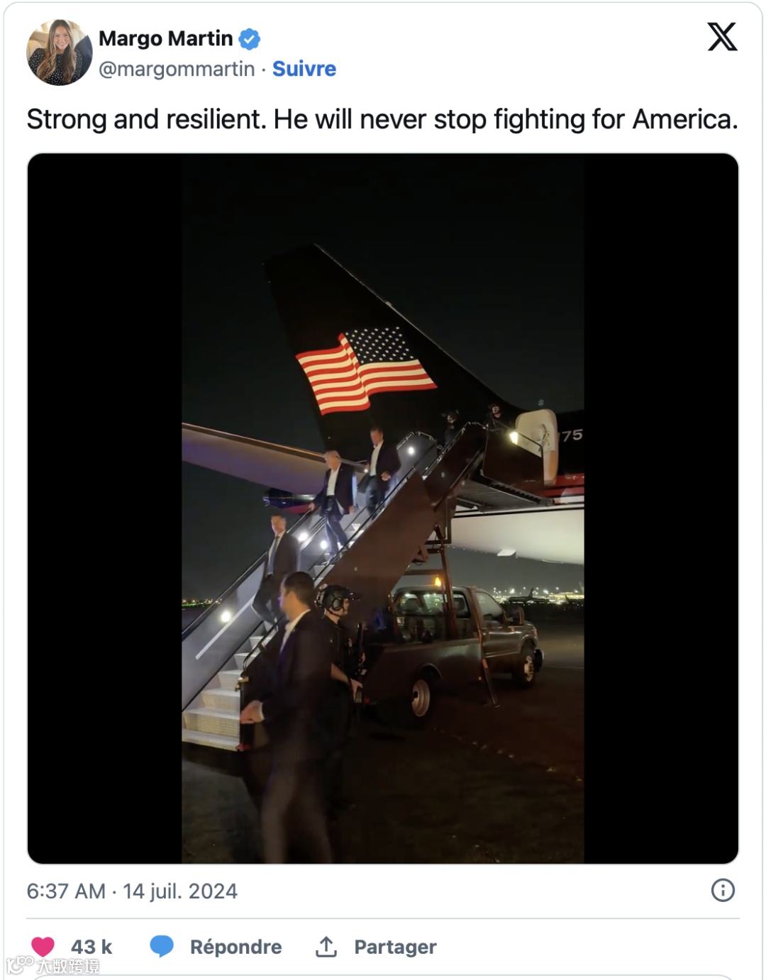 几个小时后,一段视频显示特朗普在没有帮助的情况下走下飞机,视频由他的副通讯主任发布。视频中,特朗普穿着海军蓝色西装和白色衬衫,没有打领带。他受伤的右耳在视频中并未显现。