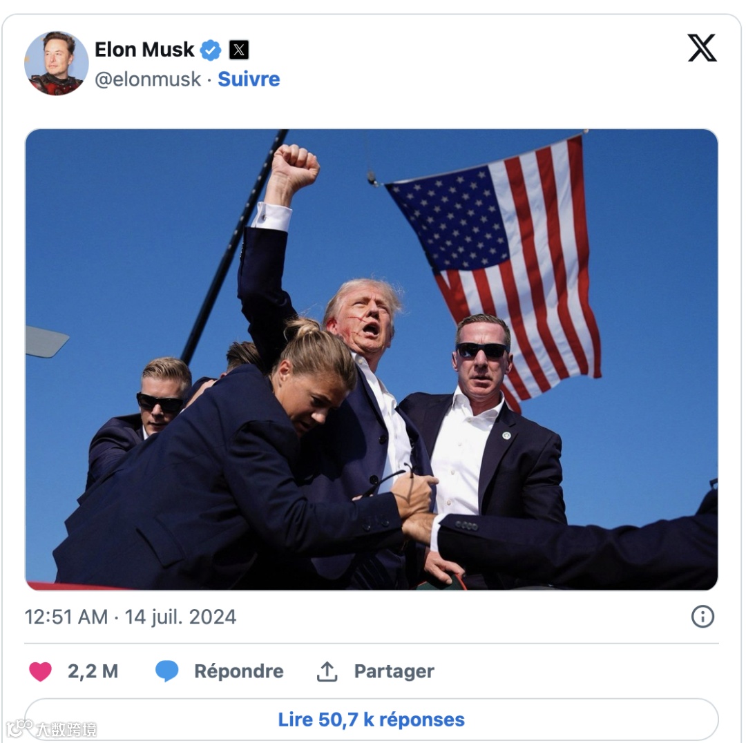 社交平台X的老板、亿万富翁埃隆·马斯克也正式表达了对特朗普的支持,分享了一张在社交媒体上广泛传播的照片。
