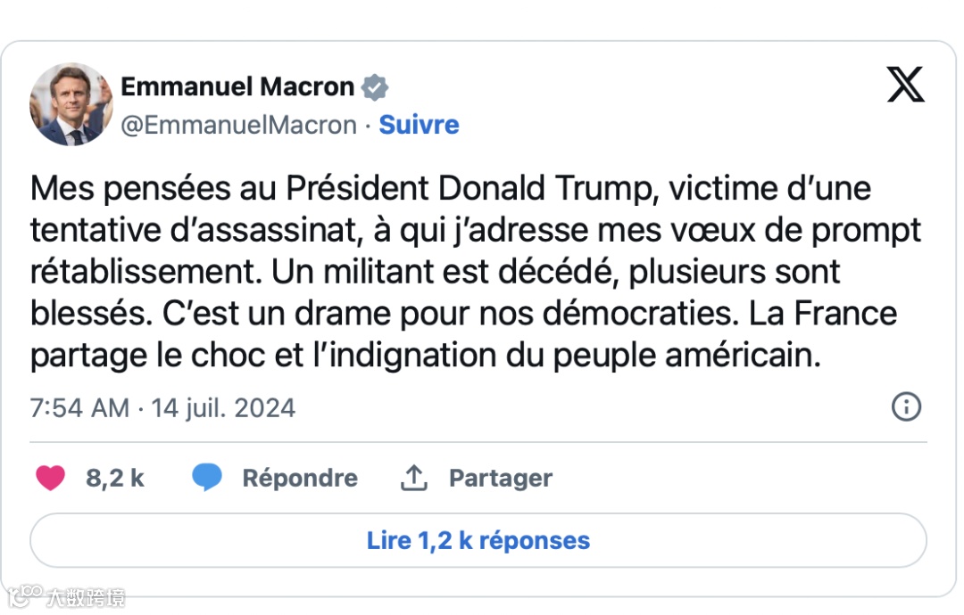 法国总统埃马纽埃尔·马克龙在社交平台上向特朗普表达了慰问,并谴责了这一暴力事件。他称这是“对我们的民主的悲剧”,并表示“法国与美国人民分享震惊和愤慨”。