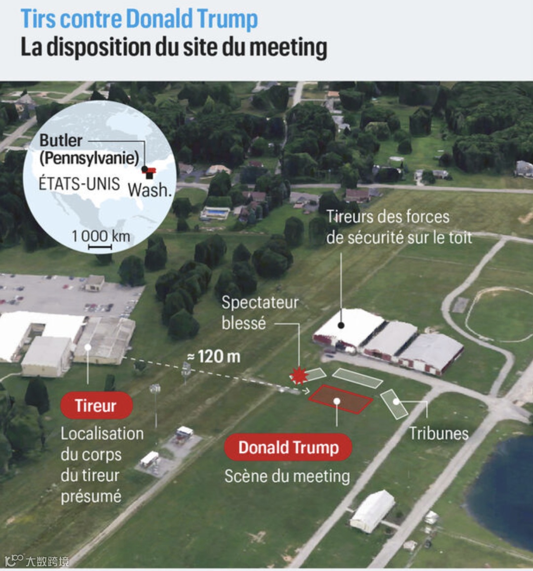 嫌疑枪手位于集会场地外,根据CNN的报道,巴特勒县检察官Richard Goldinger表示:“我不知道他是怎么到达他所在的位置的,但他在场地外。”美国特勤局在一份声明中表示,嫌疑枪手从场地外的高处向讲台方向开了几枪,随后被特勤局人员“击毙”。未验证的图像显示,嫌疑人的尸体躺在一栋低矮建筑的斜屋顶上,他就是从那里开枪的,这一行为引起了观众的恐慌和恐惧。