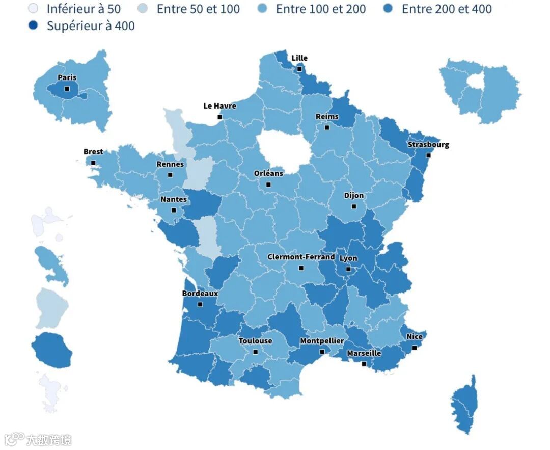 以下是法国各地区的检测率