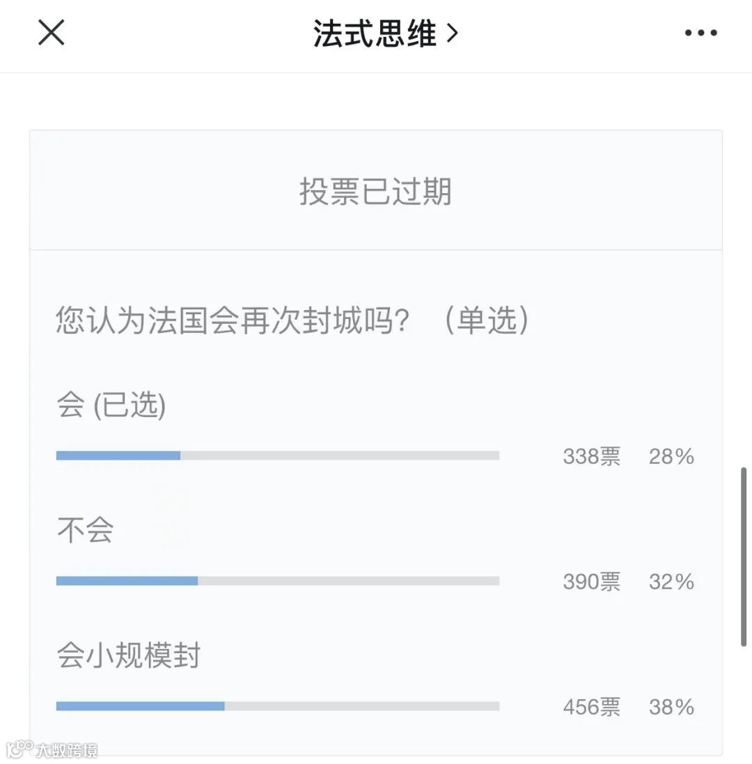 前几天法式思维发起的一项(大家认为法国还会不会再次封城)的投票调查,
