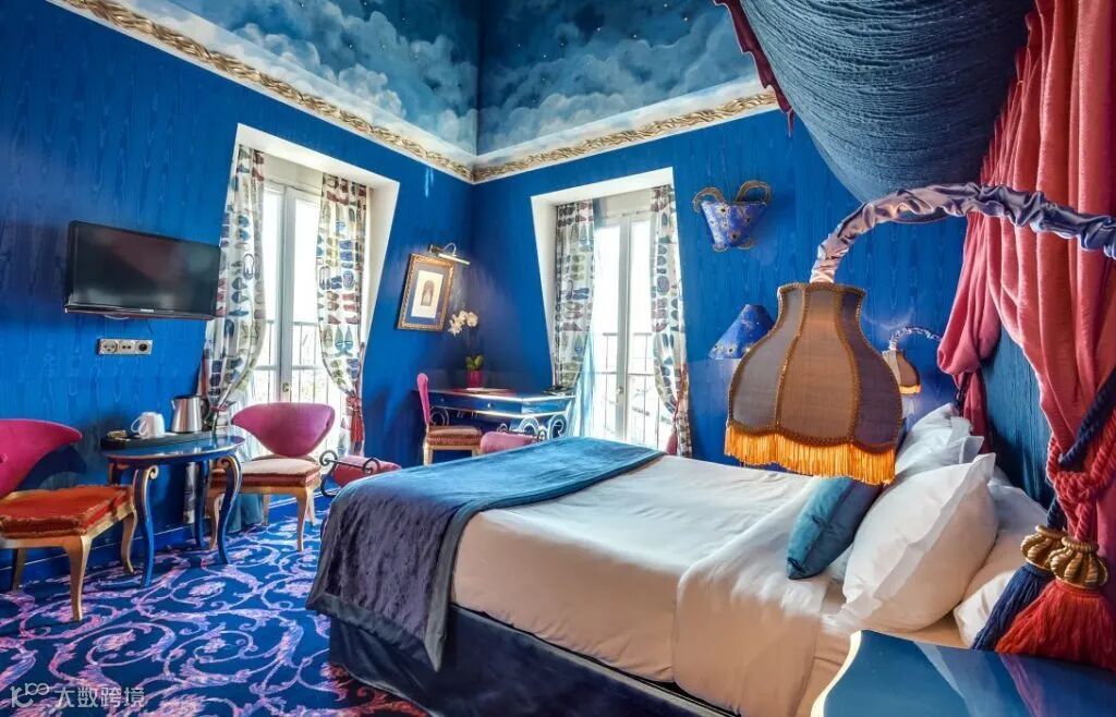 皇家别墅位于蒙马特山脚下,呈现出洛可可式的世界,深红色、绒球和软垫天鹅绒混合在一起,就像对红磨坊的致敬,部分客房可以观看到圣心大教堂的景色。