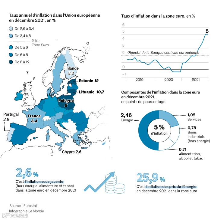 欧元区通货膨胀率创下了25年来的最高纪录,按年率计算达到5%,比前一个月上升了0.1个百分点,高于预期的4.7%。其中能源价格暴涨了26%