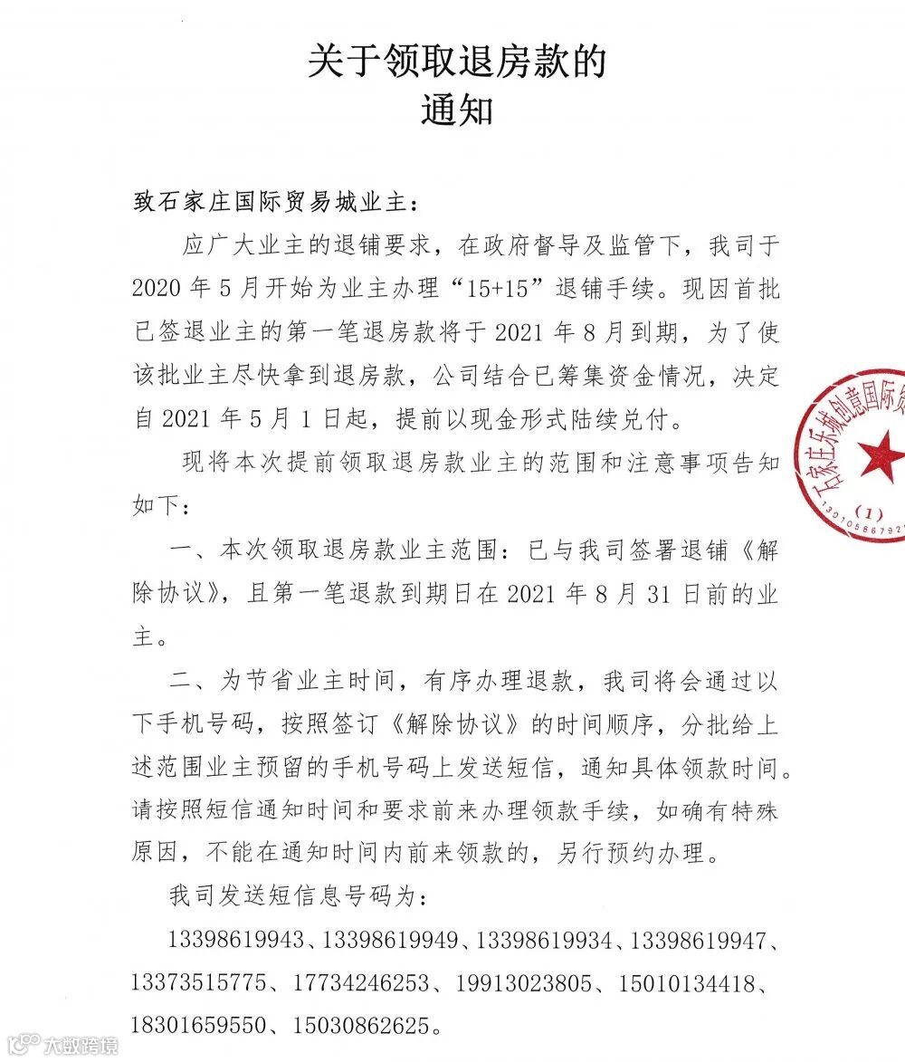 应广大业主的退铺要求,在政府督导及监管下,我司于2020年5月开始为业主办理“15+15”退铺手续。现因首批已签退业主的第一笔退房款将于2021年8月到期,为了使该批业主尽快拿到退房款,公司结合已筹集资金情况,决定自2021年5月1日起,提前以现金形式陆续兑付。