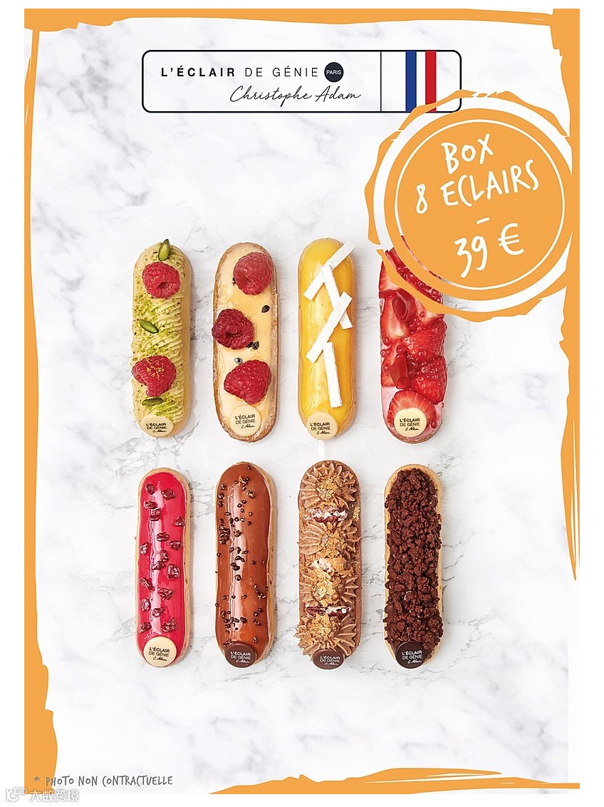 Eclaire de genie(天才泡芙)是由Christophe Adam于2012年推出的泡芙甜点店,成为了他在业界内无可争议的成功标志。他连续两年被美食杂志评为年度最佳糕点师,2017年<<名利场>>更是把他评为全球50个最有影响力的法国人第40名。可见他制作的泡芙获得了国际上的认可和欢迎。