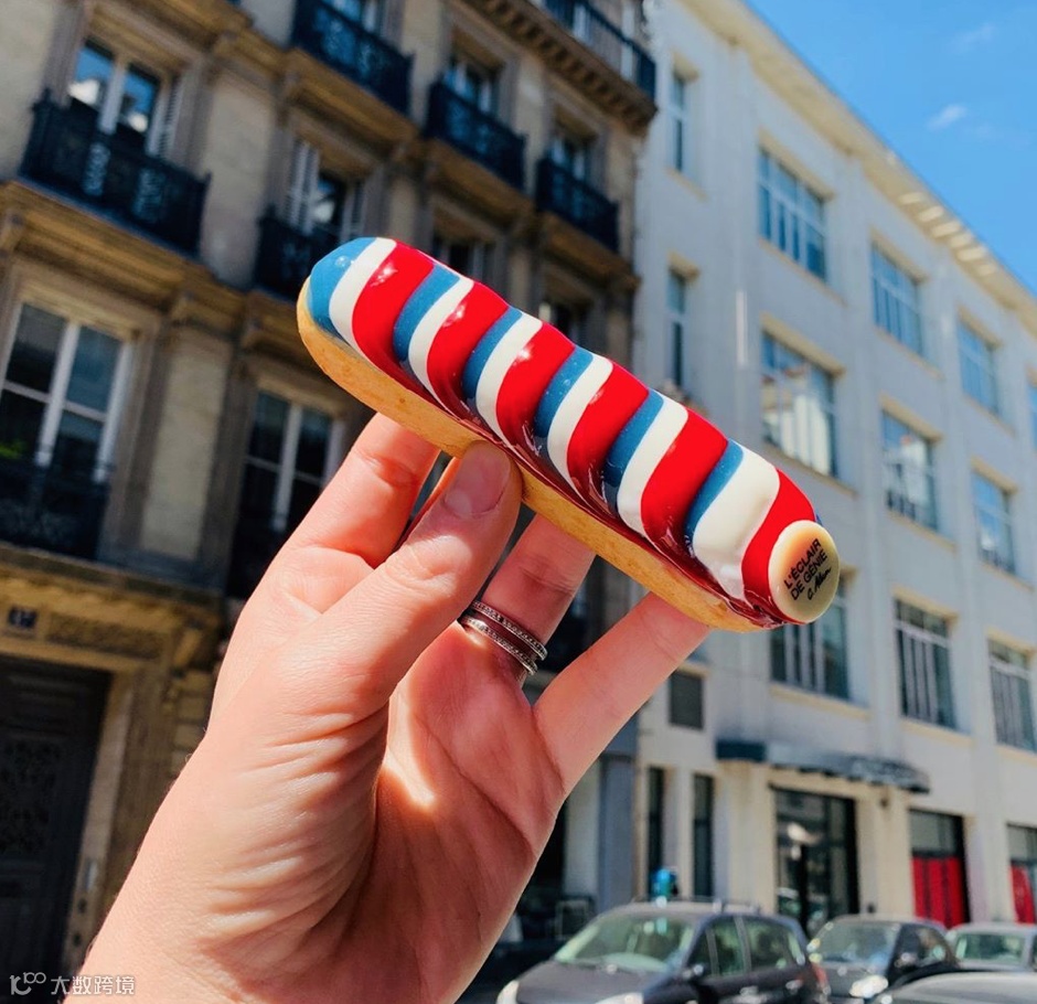 根据不同的季节或者特定的节日,泡芙的口味和外观也会有变化,比如在上个月法国国庆节的时候,它家推出的“国庆版”泡芙是这个样子的: