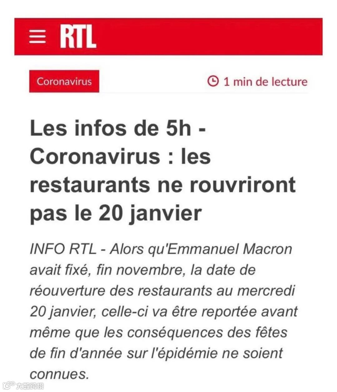 法国疫情最近又有卷土重来的趋势,据法国电台RTL的内部消息,1月20号餐厅无法重新开门的营业的消息几乎可以实锤了,这一推迟,不知道又要等到何时......