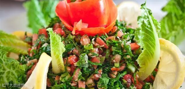 黎巴嫩菜系的前菜一般是以橄榄油调拌的各种沙拉,Tabouleh(塔布勒沙拉)是其中一款经典的沙拉,由欧芹碎、面包碎、番茄、橄榄油和柠檬制作而成。