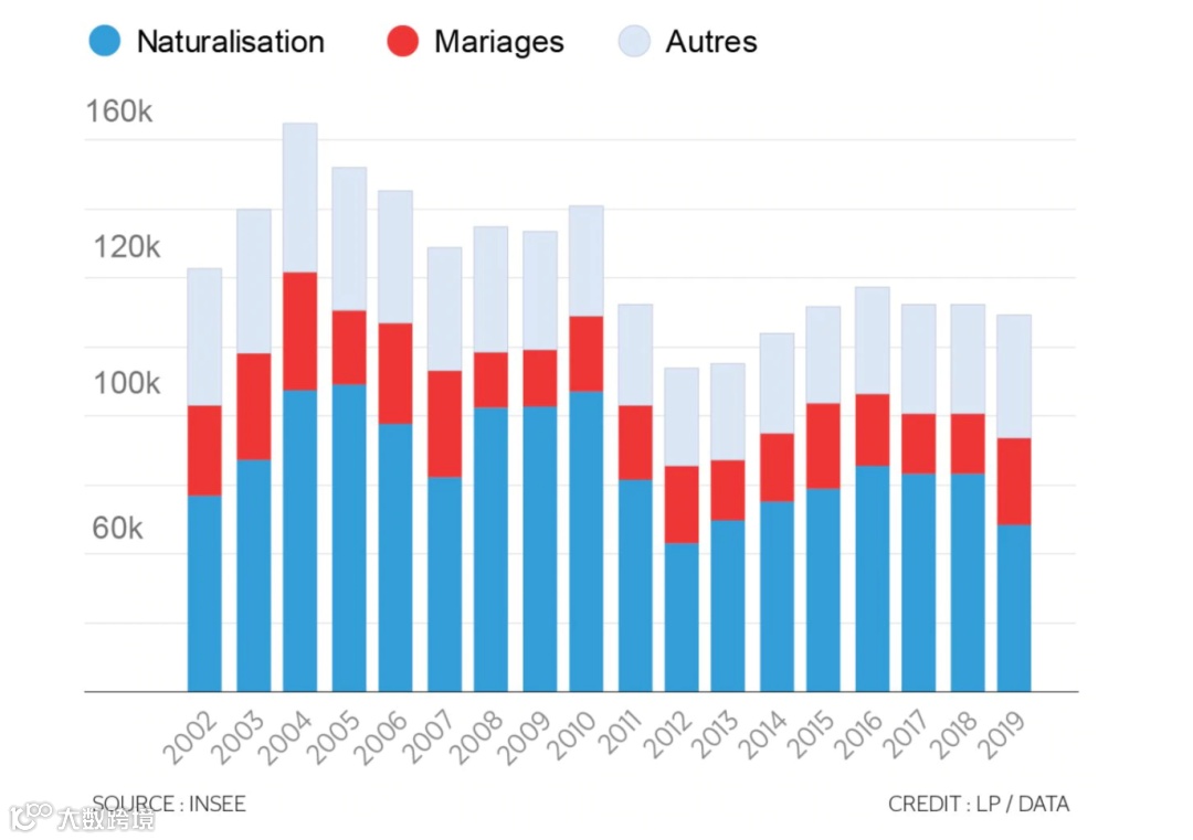 但是在奥朗德当总统时再次反转,2017年取得法国籍的数量已达到114,000个,此后几年几乎差不多。去年,有113,000人成为法国人。