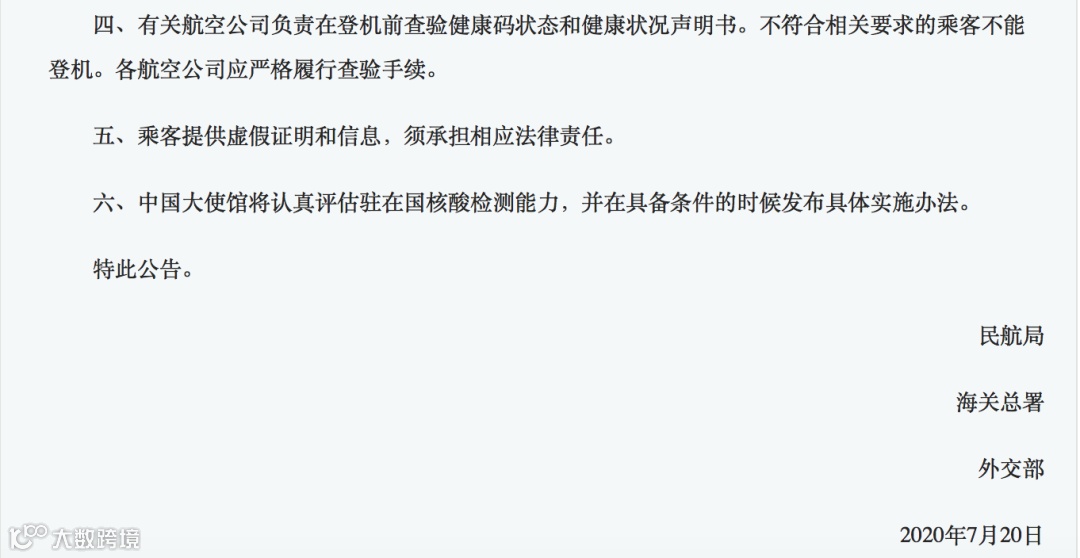 首先我们找到了《关于来华航班乘客凭新冠病毒核算检测阴性证明登机的公告》的原文,这么一看确实是出台了这么一个新规,但是仔细一读又会发现,在公告的最后一条明确提出“中国大使馆将认真评估驻在国核酸检测能力,并在具备条件的时候发布具体实施办法”。