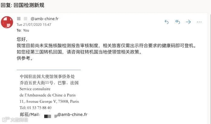 于是我们向中国驻法大使馆发送邮件询问,得到大使馆的官方回复是:“我馆目前尚未实施核酸检测报告审核制度,相关旅客仅需出示符合要求的健康码即可登机。如您经第三国转机回国,请咨询驻转机国当地使领馆相关政策。”这也就是说,目前登机出示核酸检测目前并不是强制性的。