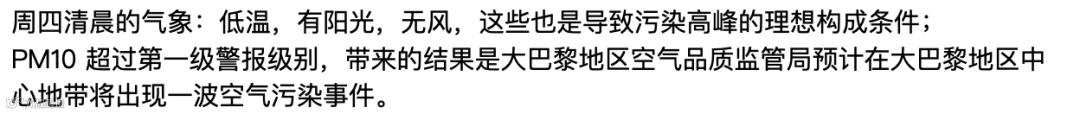 根据大巴黎地区空气品质监管局的预测,今天空气中的PM10(污染颗粒)浓度超标。