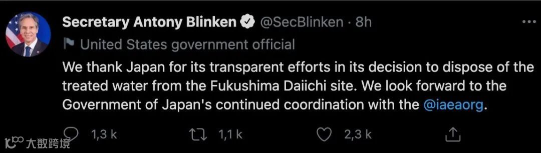 🇺🇸美国则支持日本废水入海的决定,美国国务卿布林肯发推特公开感谢日本为处理核废水所做的透明努力,期待后续和日本政府的合作👇