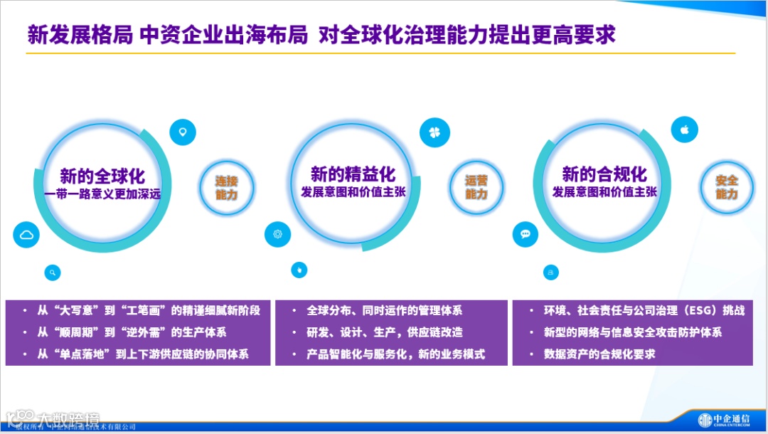詹东东概述了三个主要趋势:新的全球化、新的精益化及新的合规化。在新的全球化趋势下,“一带一路”倡议推动了中国企业不仅将产品出口,还将工厂、产能和运营模式带到国际市场。新的精益化趋势体现在精益制造的普及,这要求企业必须实现全链条的信息实时更新与管理。而在新的合规化背景下,企业面临着日益复杂的法律法规要求,特别是在信息安全和数据保护方面。