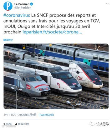由于疫情扩散的速度在不断加快,今日SNCF已经发出通知:“由于COVID-19对于旅客出行所造成的影响,对订购了4月30日以前TGV、Intercité和TER车票,但计划推迟和取消原定行程的旅客,可以免费办理退票和改签,无需支付任何费用。”