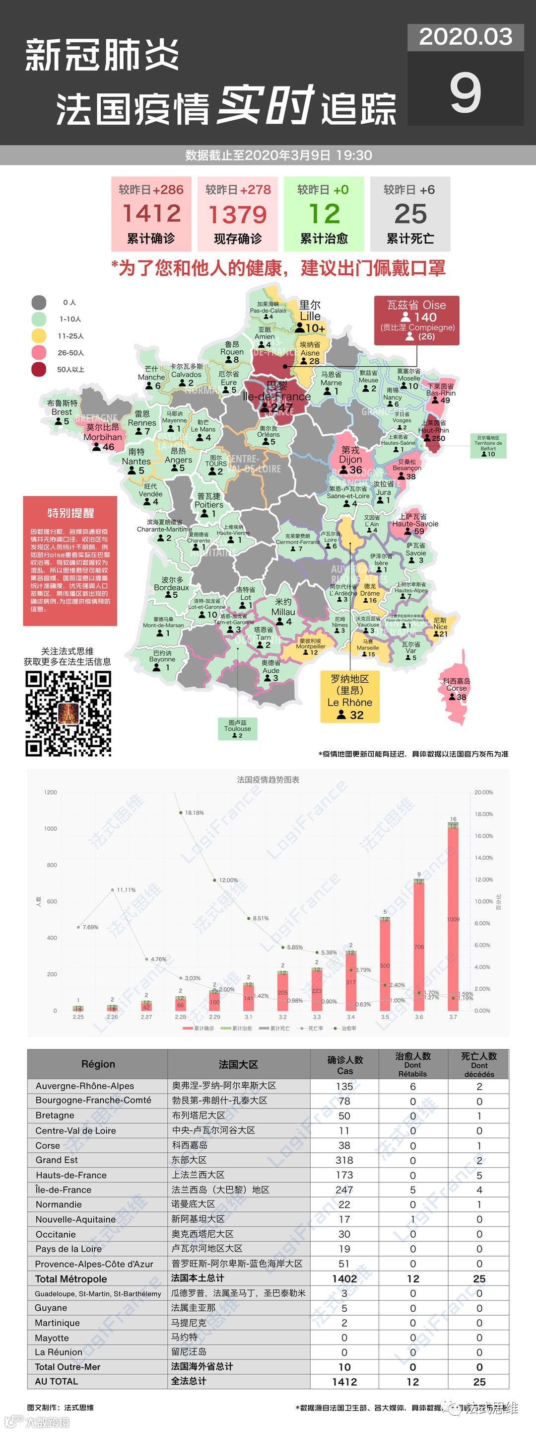 截止至3月9日19时50分,法国的确诊病例数量已经达到了1412例,较昨日增长了286例