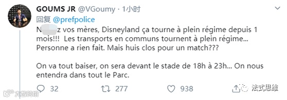 对此,有法国球迷很气愤,为什么迪士尼乐园和公共交通这么大的人流量没人管控,一场足球比赛就不给看?并且表示自己到时候将会不顾一切前往……