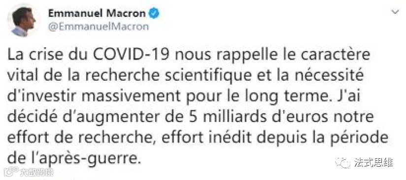 今天下午马克龙发推表示,新冠疫情将让他更加重视保持科学研究的生命力和长期大规模投资的必要性。因此,他决定增加50亿欧元研究经费用于科学研究领域。