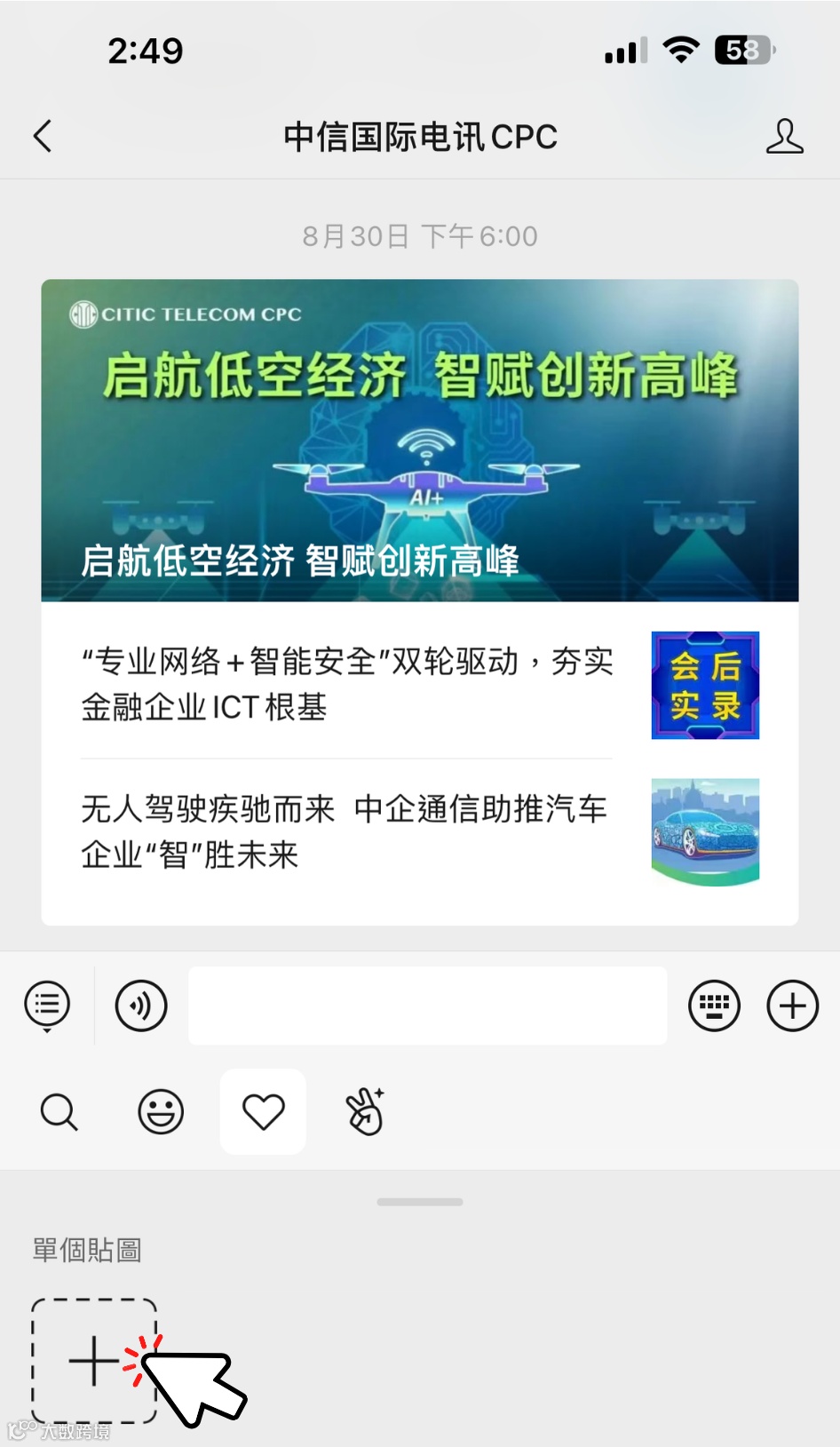 2. 开启微信,并打开对话视窗点击笑脸,点击心形,再点击加号
