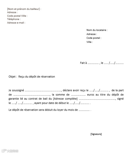 订金 Dépôt de réservation : 为了预定房屋给房东的信誉担保,