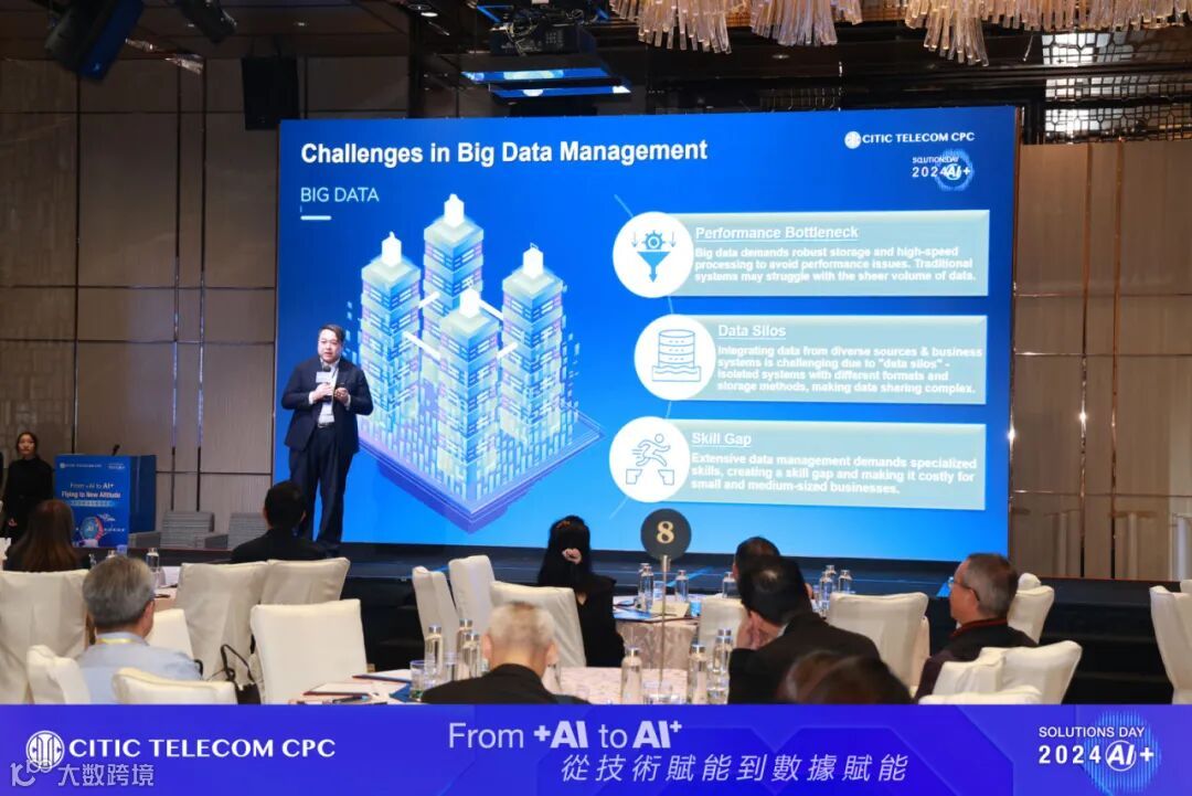 在议会上,中信国际电讯 CPC创新研发及信息技术部副总裁Ivan Lee重点介绍了智数库 (AI Databank) 大数据平台。这个平台能够整合多个业务系统数据,打破了数据孤岛问题,同时透过深度学习与大数据训练,助力企业实现有效的数据管理。结合大型语言模型(LLMs)、自然语言处理(NLP)及生成式AI (GenAI) 等技术,用户可以简单的对话互动方式快速检索所需数据,更快、更精准地生成最合适的可视化报表,并进行智能分析和对比最新及历史数据,有效从海量数据中挖掘出重要的商业价值,助力企业制定未来计划和加速决策过程。