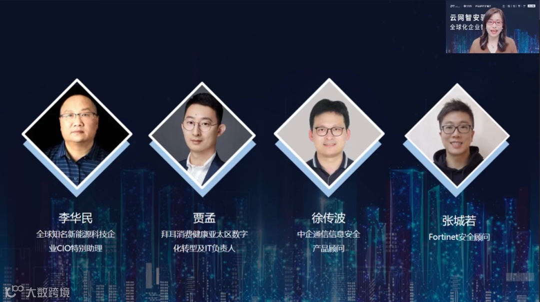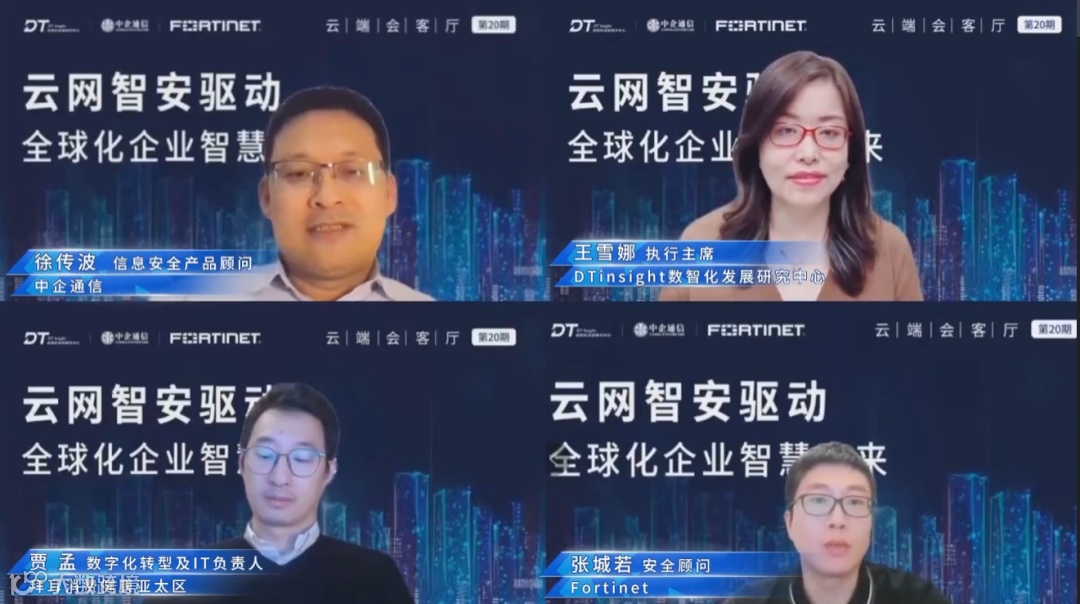 为了进一步探讨全球化企业未来的发展和转型,1月5日,中企通信携手Fortinet、DTinsight数智化发展研究中心联合举办的“云端会客厅”栏目,围绕着“云网智安驱动全球化企业智慧未来”这一主题,邀请全球知名新能源科技企业CIO特别助理李华民、拜耳消费健康亚太区数字化转型与IT负责人贾孟、中企通信信息安全产品顾问徐传波、Fortinet安全顾问张城若共聚直播间,就行业趋势、数字安全、先进技术应用等观点,探索助力全球化企业转型发展与创新的破局之道。