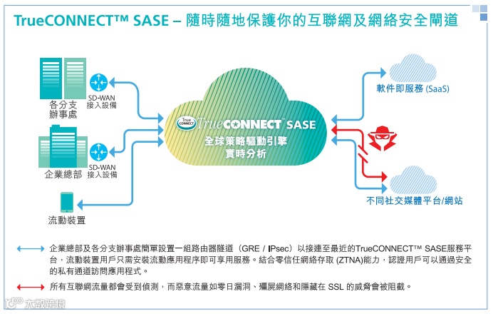 TrueCONNECT™ SASE可与中信国际电讯CPC智能化SD-WAN服务进行精确整合,通过零信任访问架构,实现更为安全的SD-WAN网络拓扑,使得企业在优化灵活的网络架构之上,拥有更为强大的安全性。