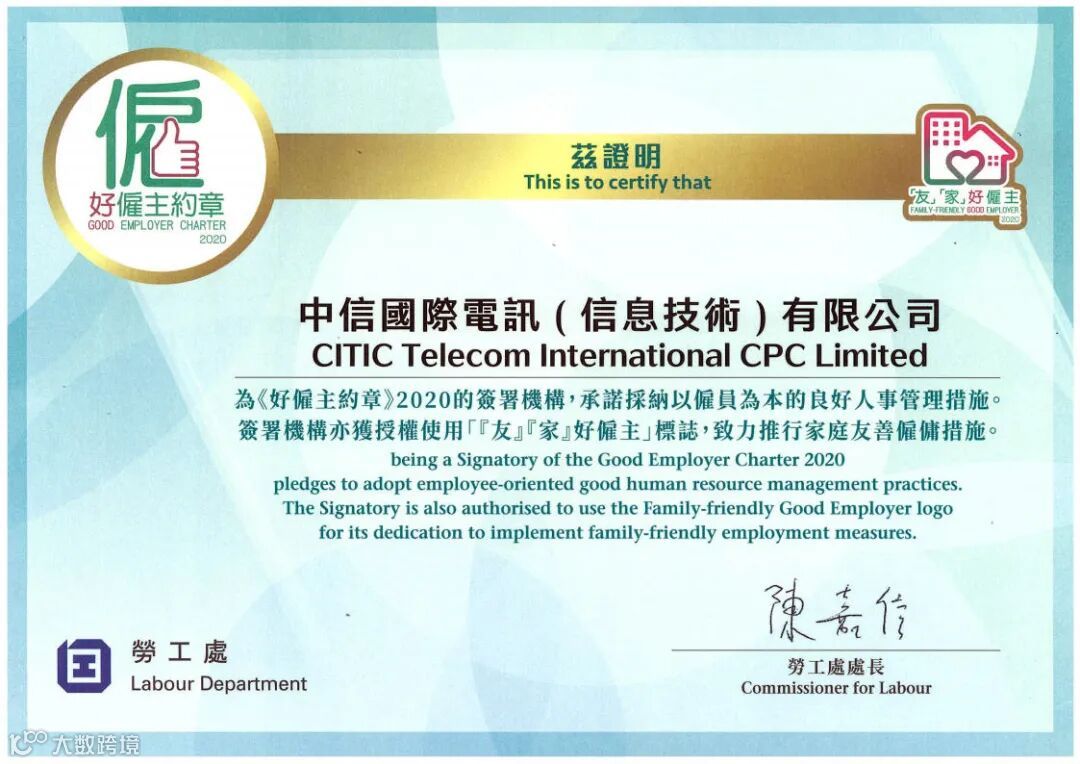 导读:中信国际电讯CPC 获香港劳工处嘉许为《友家好雇主》,并签署《好雇主约章》,承诺持续订立家庭友善雇佣政策...
