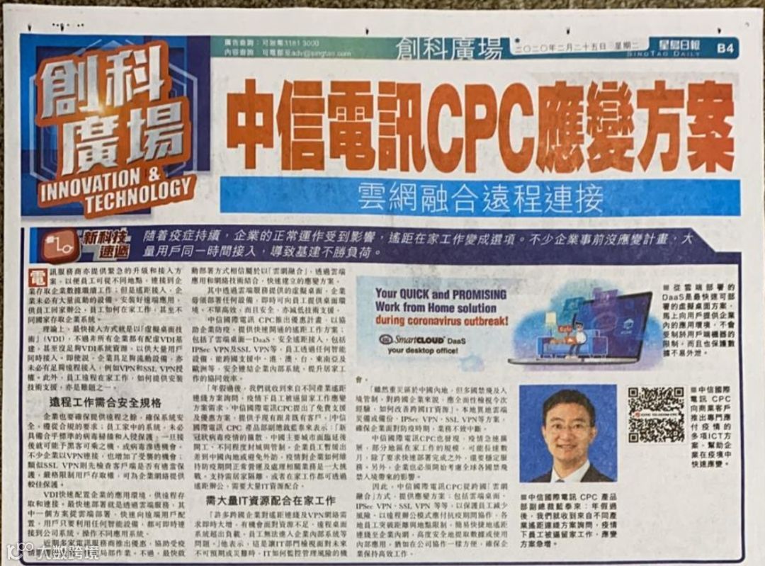 中信国际电讯CPC全力帮助企业实现员工在家远程办公的行动,获得了包括《星岛日报》在内的媒体关注和报道。 《星岛日报》的创科广场专栏专门报导及研讨创新科技的新闻,积极推广创新科技的应用。