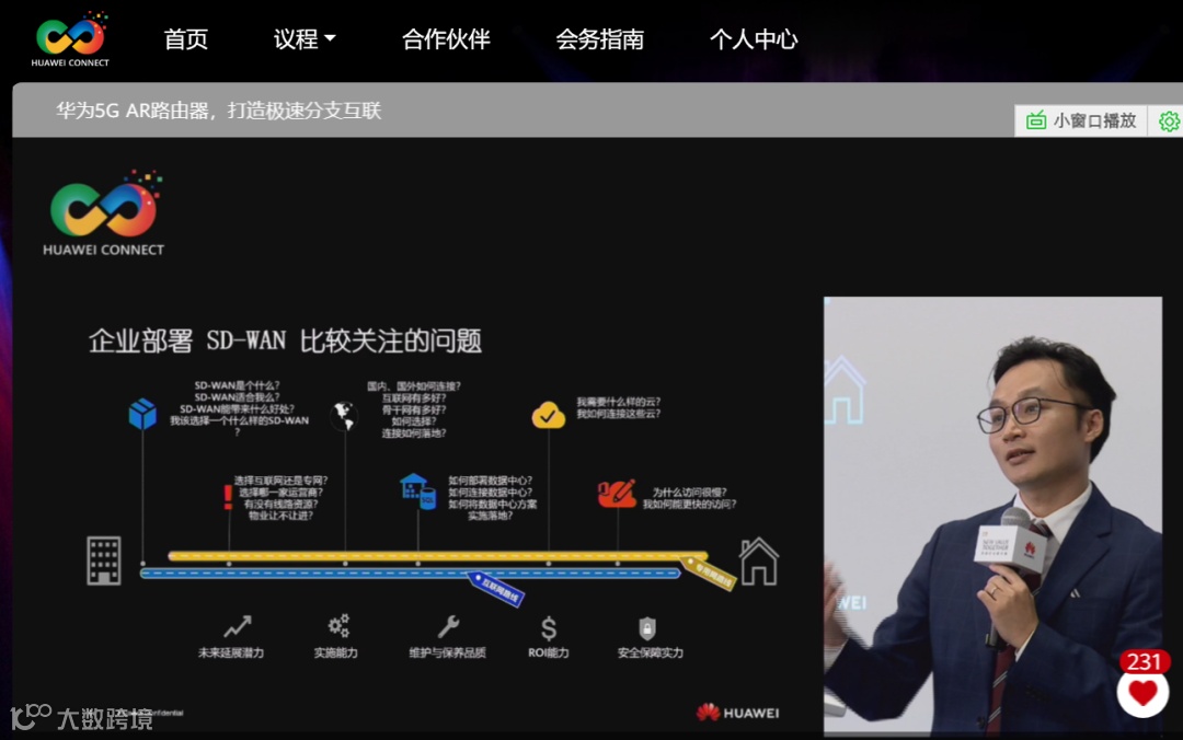 中企通信数据科学与创新副总监詹东东先生在本次大会上作《基于 5G AR 为企业客户提供高品质的 SD-WAN 服务》主题演讲并接受华为采访。在采访中,詹东东先生从多分支企业互联遇到的挑战、中企通信SD-WAN服务优势以及对双方未来的合作预期等方面作了简要介绍。