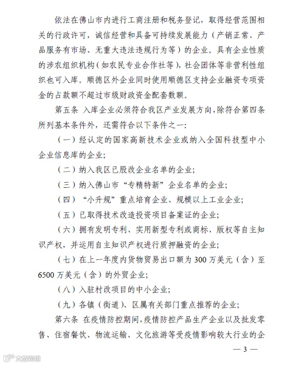 依法在佛山市内进行工商注册和税务登记,取得经营范围相关的行政许可,诚信经营和具备可持续发展能力(产销正常、产品服务有市场、无重大违法违规行为等)的企业。具有企业性质的涉农组织机构(如农民专业合作社等),社会团体等非营利性组织也可入库。顺德区外企业同时使用顺德区支持企业融资专项资金的占款额不超过市级财政资金配套数额。