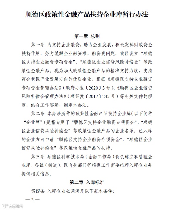 第一条 为支持企业融资,助力企业发展,积极发挥财政资金扶持作用,努力缓解企业融资难、融资贵问题,我区设立“顺德区支持企业融资专项资金”、“顺德区企业信贷风险补偿金”等政策性金融产品。现为加大政策性金融产品的精准支持力度,支持符合我区产业发展方向的优质企业,根据《顺德区支持企业融资专项资金管理办法》(顺府办发〔2020〕3 号)、《顺德区企业信贷风险补偿金管理办法》(顺经发〔2017〕245 号)等有关文件的规定,结合工作实际,制定本办法。